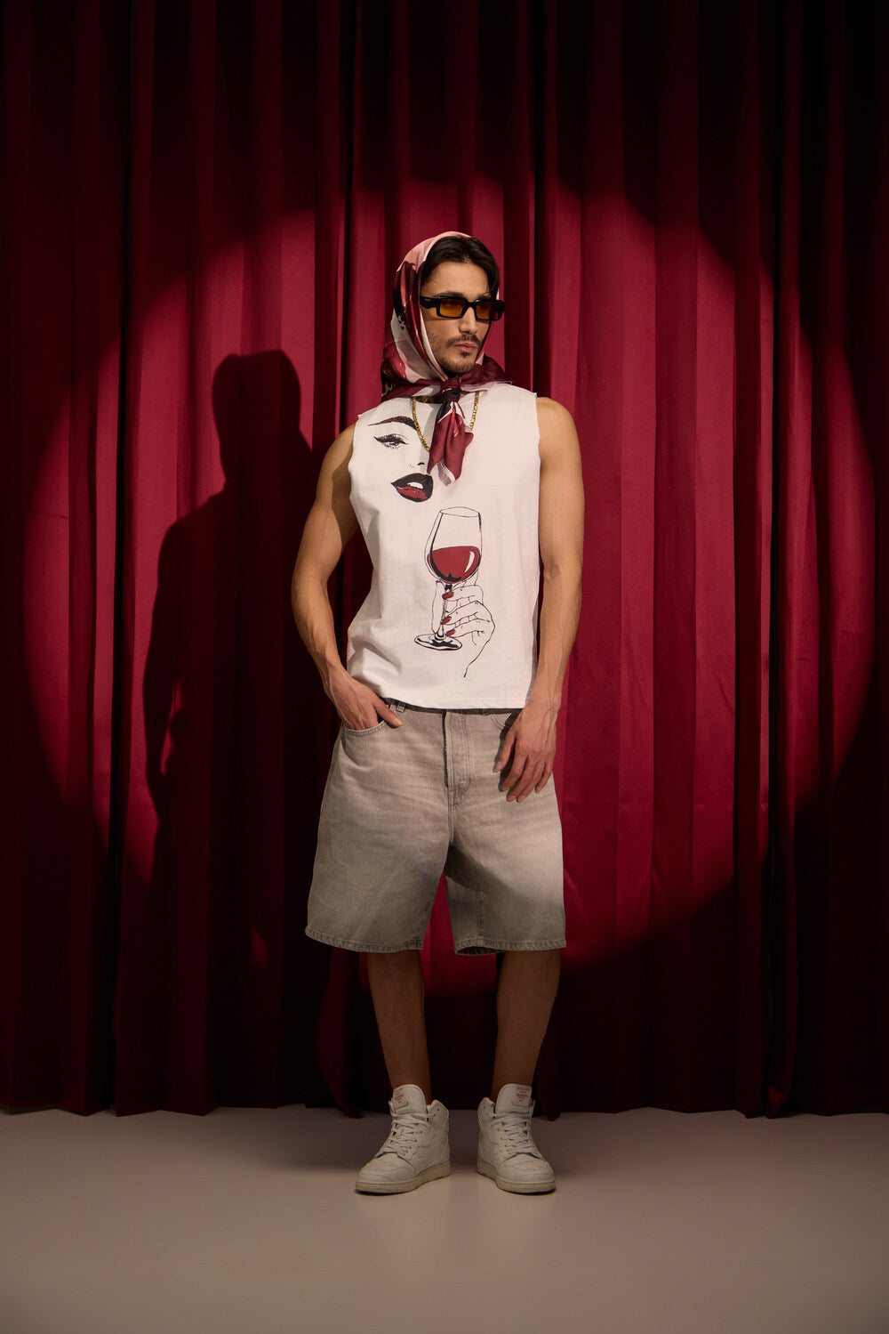Pour it up, wear it loud. This unisex sleeveless tee is made from 100% cotton and features a bold screen print of a wine glass and red lips — a whole mood in one look. Easy to style, easier to steal the spotlight in.