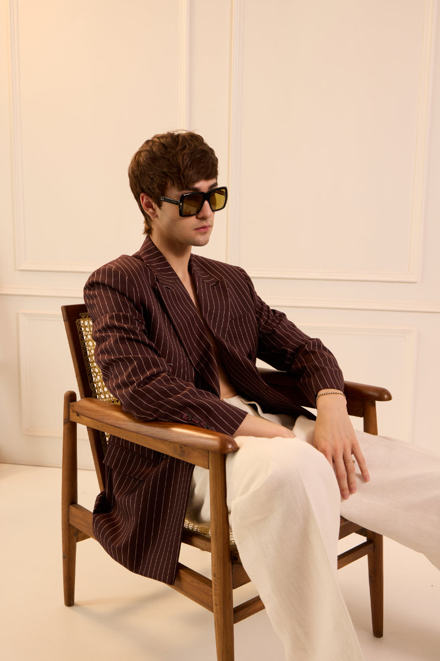 Double-breasted, pinstriped, and anything but traditional. This wine blazer features structured shoulders, peak lapels, and a tailored cut designed to elevate both sharp suiting and off-duty layering.